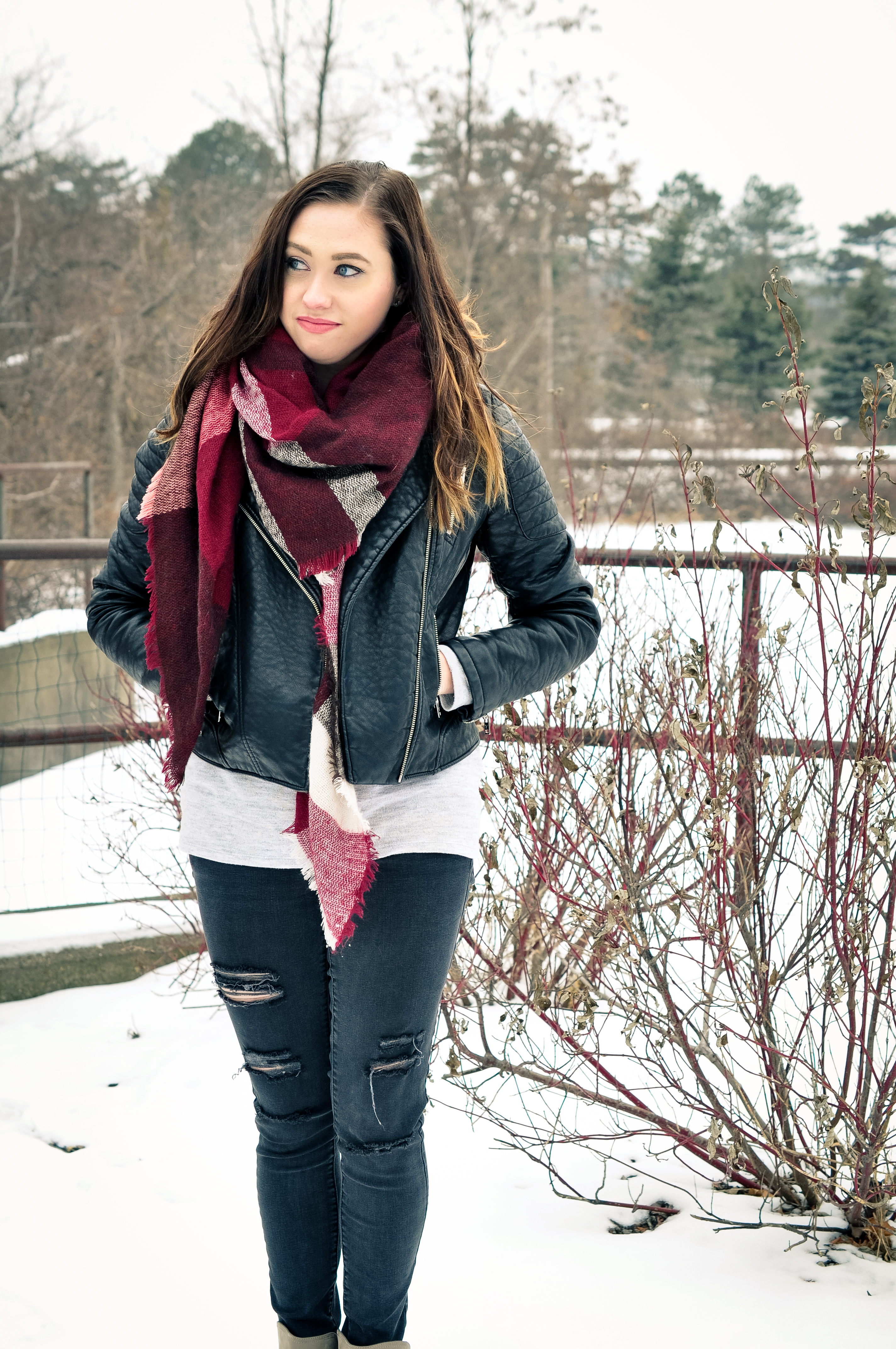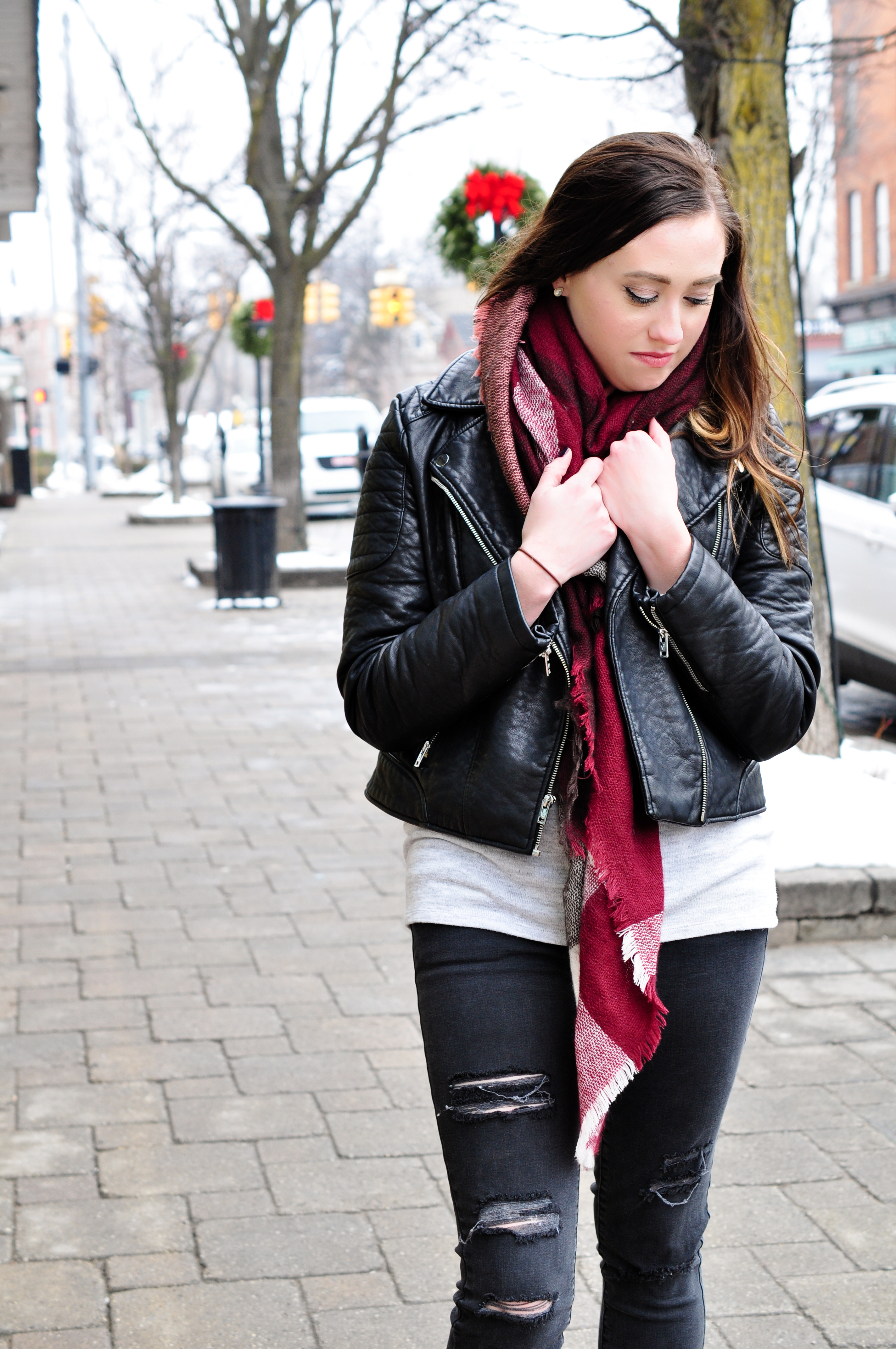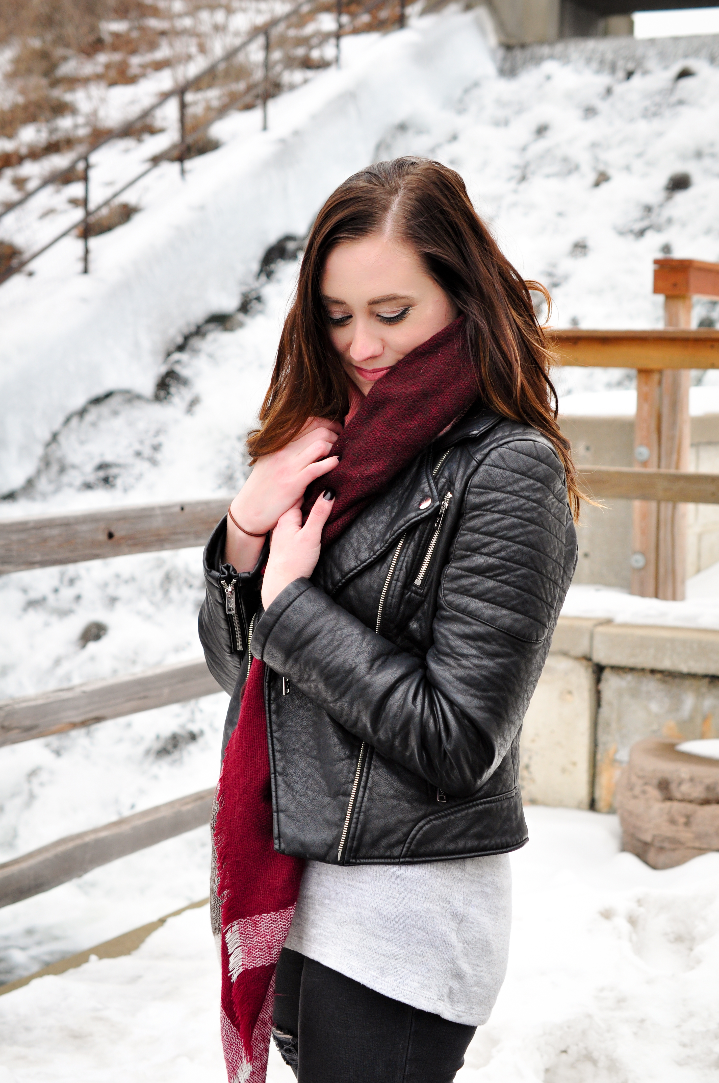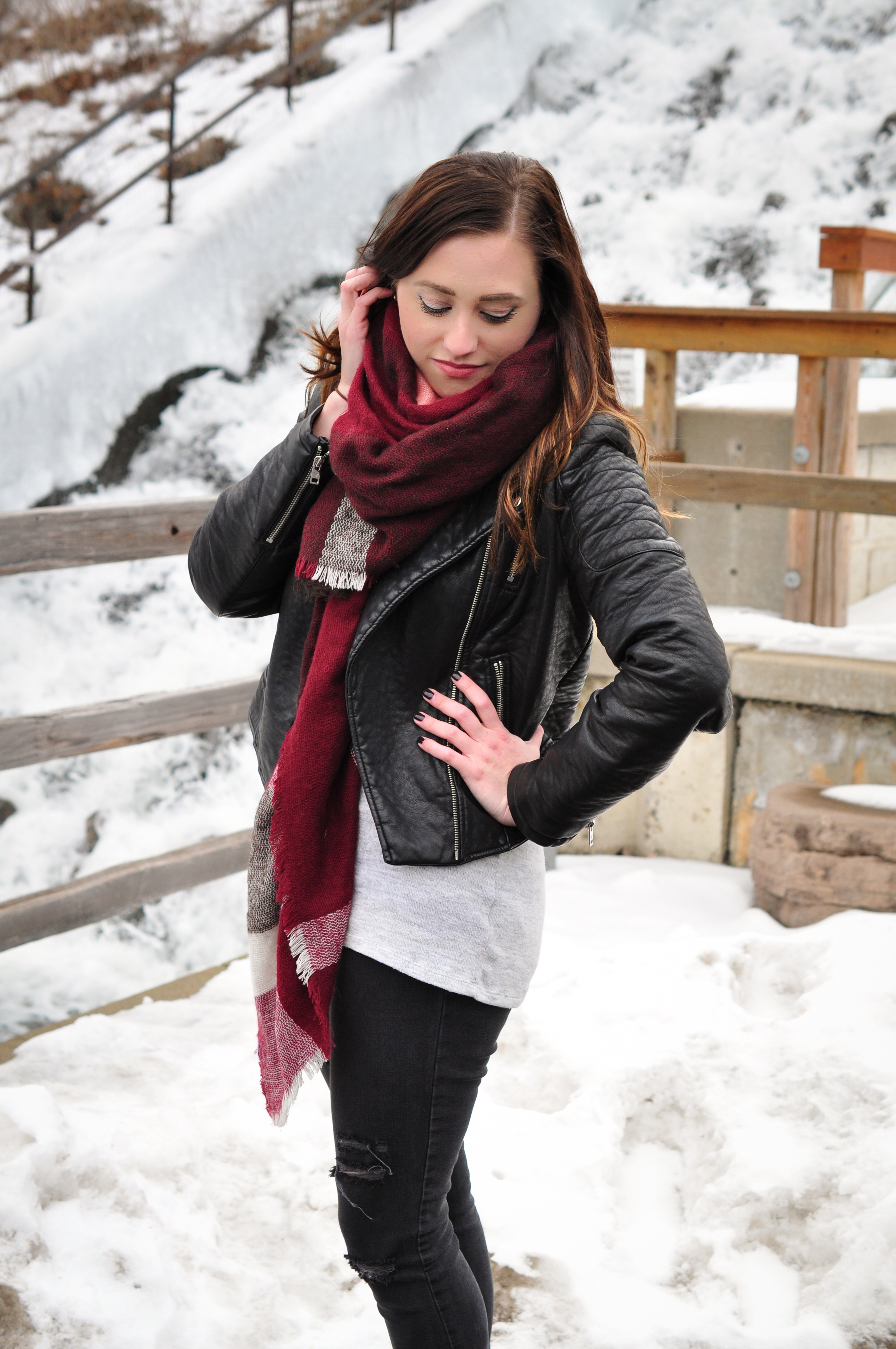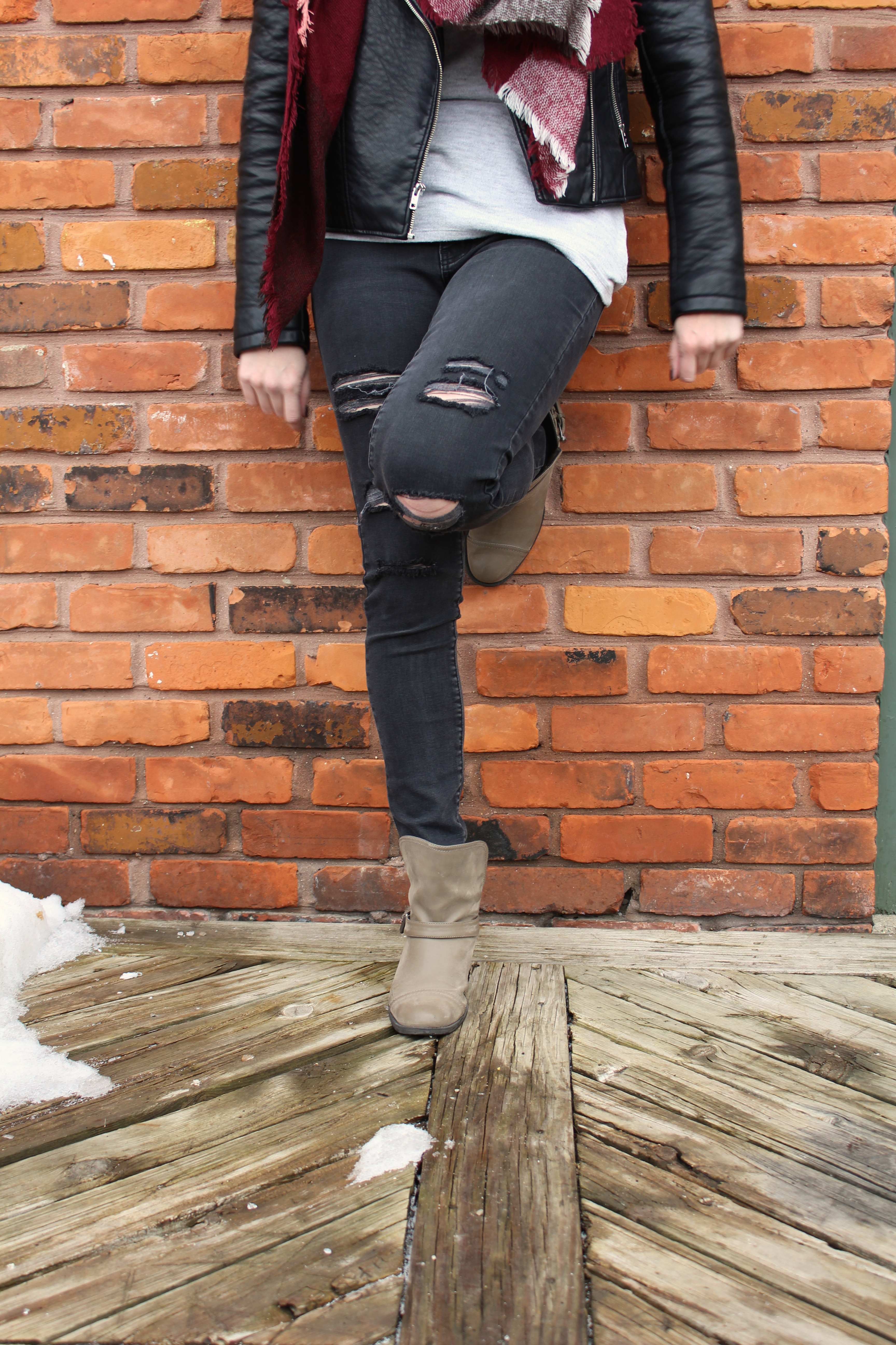 I think my style is very simple yet detailed. I love a good destroyed jean and moto jacket and pairing the two with a scarf adds the touch of girl I need to my style. I have a hard time getting away from black and grey tones so sometimes the details add that perfect pop of color. This simple combo has been my go-to lately and I’m still not sick of it yet!